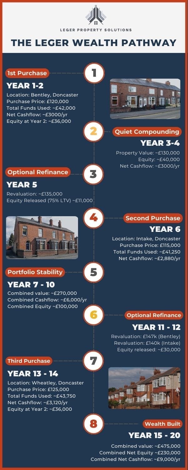 It’s a 5-step system: acquire well, improve where it counts, let and hold, refinance to release equity, and repeat. This structured approach compounds wealth over time while you stay focused on your career.