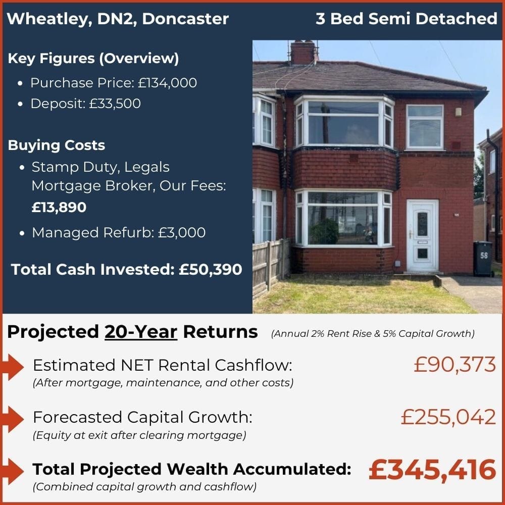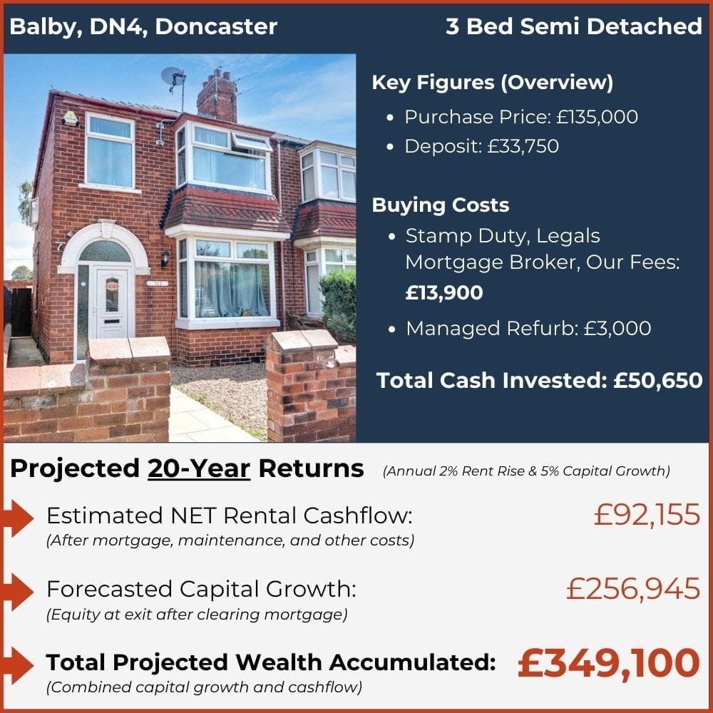 Typically £50,000-£60,000 is required to comfortably cover deposit, fees, and setup costs for a high quality buy-to-let in Doncaster.